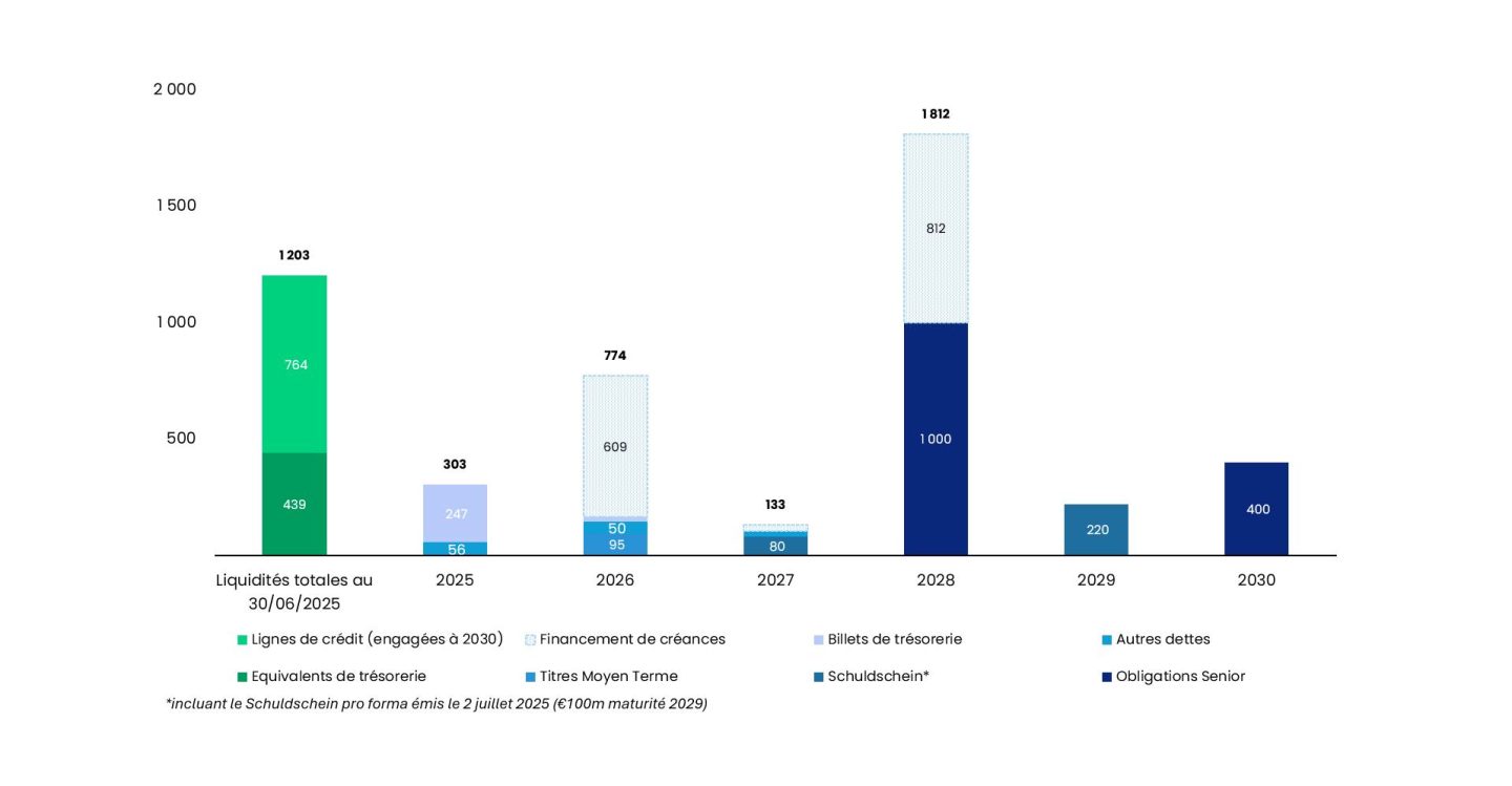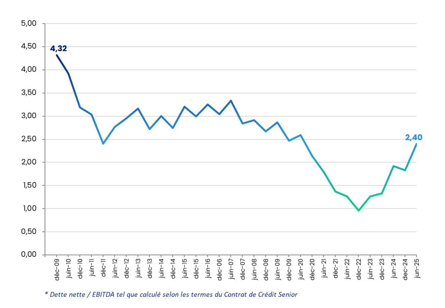 Au 30 juin 2025, la dette financière nette du groupe s’élève à 3 077,8 millions d’euros, soit 3 367,4 millions d’euros de dette financière brute moins 439,3 millions d’euros de trésorerie et équivalents de trésorerie, plus 149,8 millions d’euros autres.